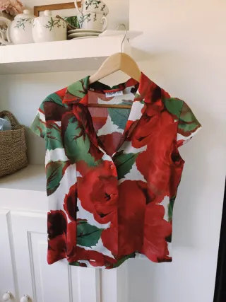 Camisa vintage con un llamativo estampado floral. - Diseño de flores rojas y hojas verdes. - Cuello camisero. - Cierre de botones. -.un poco transparente