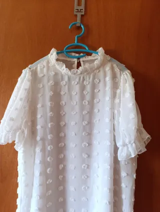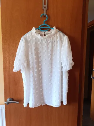 Blusa blanca de manga corta. Talla aproximada 48. Medidas: de hombro a hombro 40 centímetros; de sisa a sisa 57 centímetros; largo 62 centímetros. Usada, buen estado.