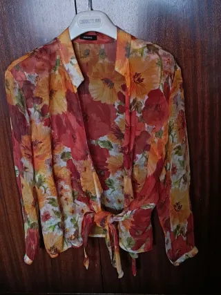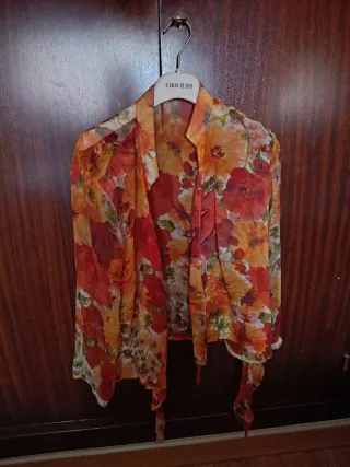 Blusa vintage con un vibrante estampado floral. - Diseño ligero y vaporoso. - Mangas largas. - Cierre frontal.