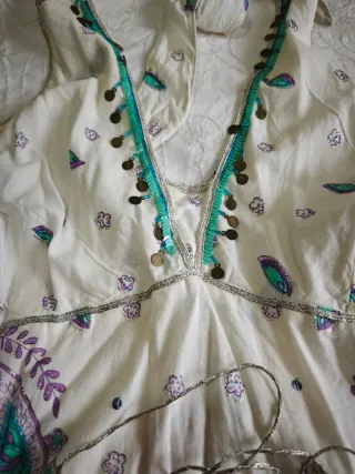 Bonita blusa marca Flamenco con un diseño vintage. - Estampado paisley en tonos morados y verdes. - Detalles de lentejuelas y abalorios. - Escote pronunciado con tiras. - Diseño tipo halter.