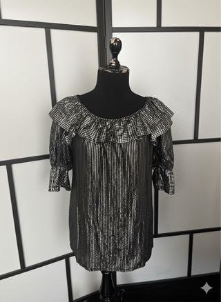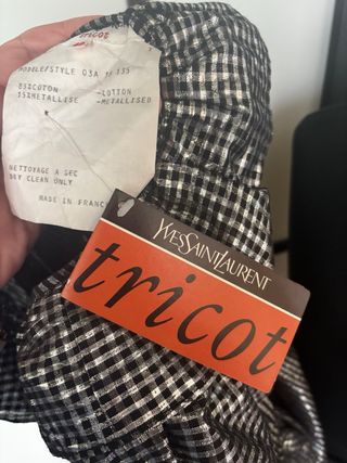 [ES] Espectacular blusa vintage auténtica de Yves Saint Laurent Tricot. Una verdadera pieza de archivo, fabricada en Francia, en estado impecable (sin estrenar/deadstock). • Estado: Nuevo sin etiquetas, perfectamente conservada. • Diseño: Rayas verticales metalizadas plata/negro con gran cuello de volantes en contraste (cuadro vichy). • Composición: 85% Algodón de alta calidad y 15% Hilo metalizado. • Detalles: Fabricada en Francia, talla 40 (vintage). Ideal para coleccionistas de la marca. [FR] Blouse vintage iconique Yves Saint Laurent Tricot. Pièce d'archive authentique, fabriquée en France, état neuf (jamais portée). • État: Neu