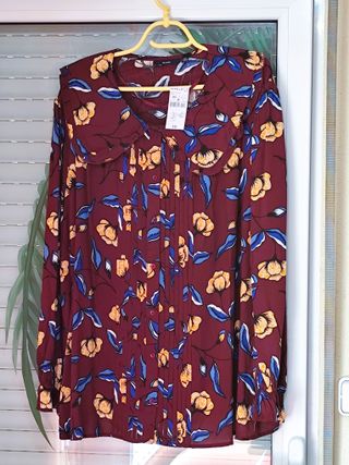 Blusa vintage con un bonito estampado floral. - Diseño con flores en tonos marrones y morados. - Cuello con detalle. - Tejido agradable al tacto.