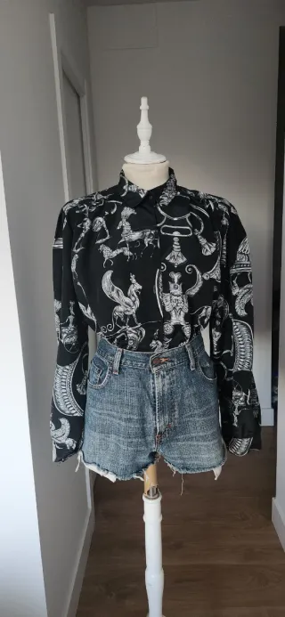 Preciosa blusa de estilo vintage con un diseño único. - Tejido satinado con estampado lineal. - Cierre de botones dorados. - Dos bolsillos en el pecho.