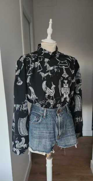 Preciosa blusa vintage con un estampado único. - Diseño llamativo en blanco y negro. - Manga larga. -Cuello de solapa