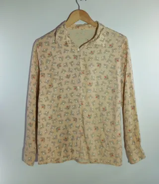 Preciosa blusa vintage con un estampado floral único. - Diseño de manga larga. - Cuello camisero. - Cierre de botones al frente.