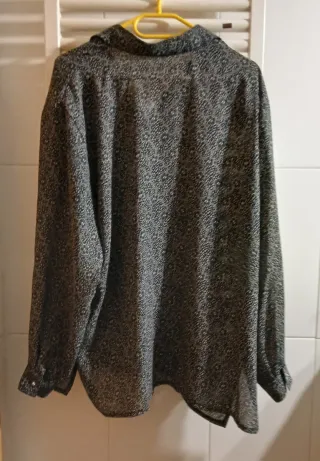 - Camisa manga corta - Cierre central con cuatro botones - Material: 100% poliester - Hecho a mano - Diminutas manchitas en el delantero derecho del uso. Practicamente imperceptibles. - Talla: L - Medidas: Ancho de sisa: 56 cm Largo de prenda: 58 cm Largo de manga: 33 cm