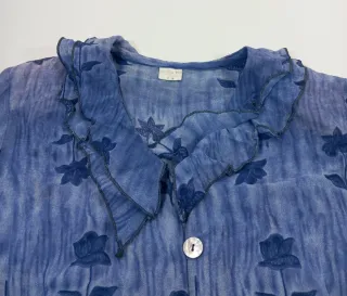 Blusa de estilo vintage con un diseño texturizado y detalles de volantes. talla 40 blusa y falda 44cm - Cuello camisero. - Cierre de botones. - Mangas tres cuartos con volantes. hombreras - Tejido con relieve floral.