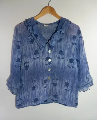 Preciosa blusa vintage con un estampado floral en tonos azules. Su diseño con volantes en el cuello le da un toque romántico y elegante. - Tejido ligero y vaporoso. - Cierre de botón nacarado. - Mangas largas. 🤩En mi perfil tengo más prendas, Jerseys, Track Jacket, camisetas deportivas y polos. los precios son negociables