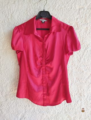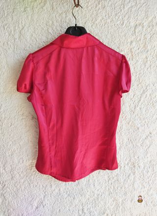 Camisa Blusa vintage en color rojo y manga corta. No es elástica. Tiene el tejido suave, fino y brillante. Material poliéster. Estilo moda Y2K de los años 2000. Marca Mango. Talla M Medidas aproximadas sisa a sisa de 48 cm y largo de 60 cm.