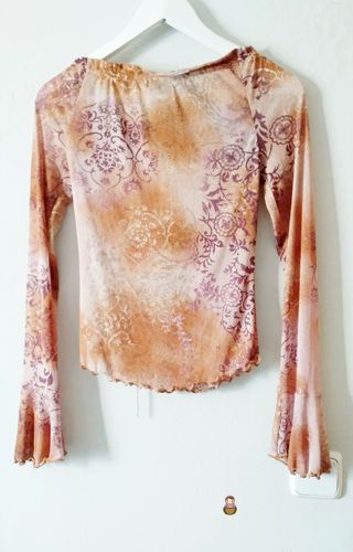 Blusa Camiseta vintage estilo hippie boho en tonos beige, marrón y morado. Manga larga cuenta con un delicado toque de transparencia y está confeccionada en una fina tela de licra elástica que se adapta perfectamente al cuerpo. Cuello estilo barca. Material Poliéster. Marca Stradivarius. Moda Y2K años 2000. Etiquetada como Talla L Se ajusta a la Talla M. Medidas aprox sisa a sisa de 42 a 52 cm y largo de 56 cm.