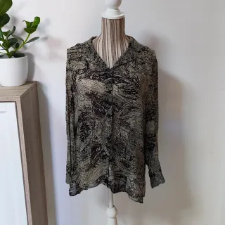 Blusa con estampado de leopardo en tonos beige y negro. Diseño elegante y moderno. Marca Shein Curves talla 1XL. - Manga larga abullonada. - Cuello en V con detalle. - Tejido ligero y fluido.