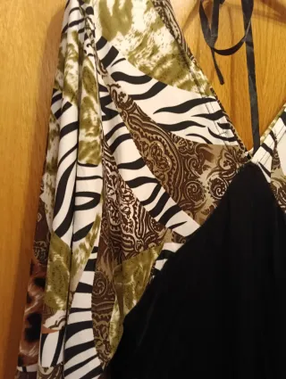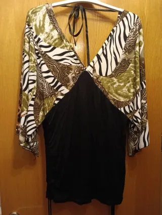 Blusa con un diseño llamativo y manga ancha. - Estampado de animal print y paisley. - Escote pronunciado en V. - Detalle de lazada en el cuello. - Cuerpo inferior liso en negro. Blusa larguita co scote en pico delantero y trasero. Talla XL. Marca Baihe. Está perfecta, usada en una ocasión, se vende por quedar pequeña. Más ropa de todo tipo en mi perfil, échale un vistazo.