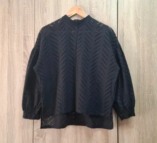 Blusa negra de manga larga y cuello tipo perkins. Las mangas son con volumen y tiene puños. La tela es algodón con bordado calado chevron. Es más larga por detrás con corte en los laterales. Se abrocha con cremallera trasera en el cuello. Es de corte amplio, queda muy elegante. Está prácticamente nueva, usada un par de veces. En la etiqueta pone talla L pero es tallaje grande, es perfecta para una talla XL. Sienta muy bien! De Shein. Dejo las medidas a continuación para que puedas comparar con una prenda tuya: Hombros: 57 cm Sisa: 57 cm Largo: 53 delante, 60 detrás Escucho ofertas. Envío en 24 horas!🫶🏻☺️