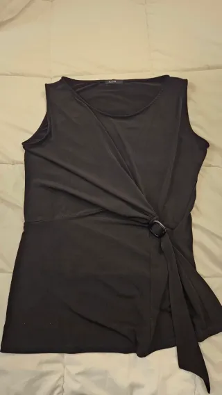 Elegante blusa negra sin mangas, con un diseño de drapeado a un lado recogido con una anilla. Poliester y elastano. Sienta muy bien. Mide 53cm de sisa.