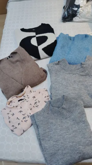 Conjunto de prendas de vestir para mujer.talla grande 46 todo elástico y adaptable a cualquier cuerpo. - Jersey de punto con diseño geométrico en blanco y negro. - Jersey de punto azul claro. - Cárdigan de punto marrón. - Jersey de punto gris jaspeado. - Jersey de punto gris con cuello alto. - Blusa rosa con estampado de pájaros.,etc...No envío.