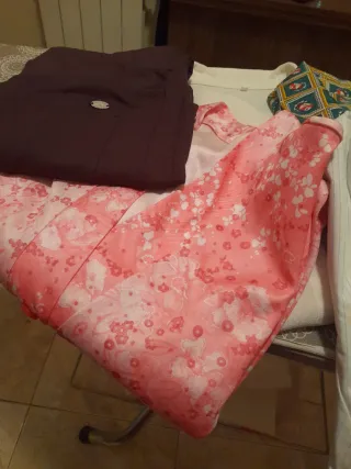 Lote de 7 prendas de ropa para mujer en tallas 42/44. - Incluye prendas en tonos marrones y rosas. - Variedad de estilos para un guardarropa completo.2 sujetadores t 90 como nuevos 2 blusas camiseras 1 bata Rosa 1 mallas marrón 1 blusa rayada