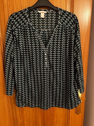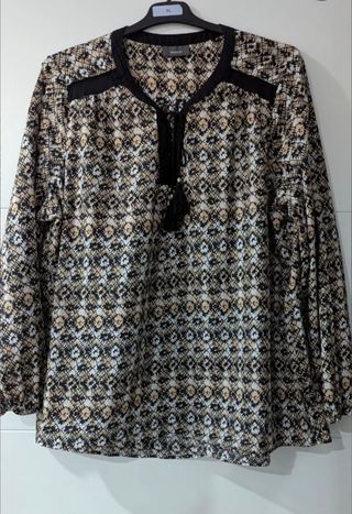 Blusa cómoda con un bonito estampado. Marca talla XL pero da talla para 46-48. Mide de sisa a sisa 64 cm. Largo 70 cm. Compra lotes y paga solo un envío. - Diseño con cuello en V y botones. - Manga larga. - Tejido suave y agradable.