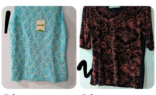 Blusas a 3,50€ unidad. 1)Jersey de tirantes de la marca Limonatta con un diseño encantador. - Tejido azul claro. - Adornado con pequeñas flores en relieve y lentejuelas. - Talla XL, axila a axila 40cm.largo 58 2)Blusa de la colección Corto Paxi con un estampado floral. - Diseño con mangas 3/4. - Panel lateral liso en contraste. - T-46, axila a axila 45 largo 66 cm.