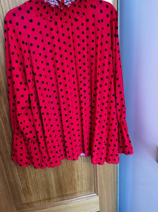 Preciosa blusa de verano con estampado de topos blancos sobre fondo rojo. Es de manga corta y tiene un bonito cuello blanco. Está en perfecto estado.
