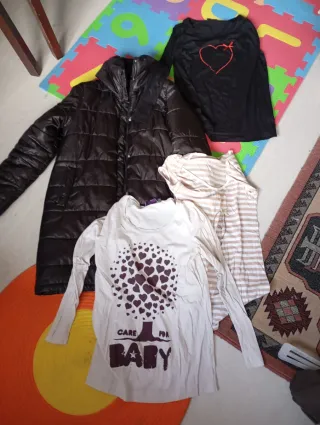 Conjunto de ropa de premamá que incluye varias prendas. -abrigo acolchado negro -5 pantalones -2 mayas -Varias blusas -Camisetas Los pantalones serian una talla 42 (creo que dan poca talla) y las partes de arriba talla M.