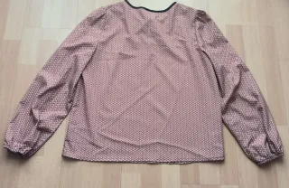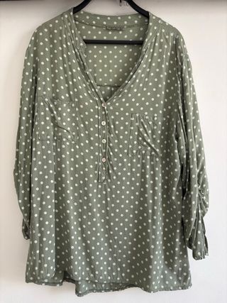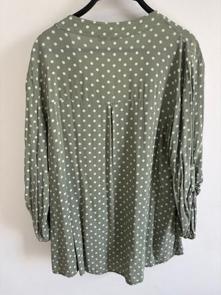 Blusa amplia de manga larga, tejido fluido (viscosa), con estampado de lunares blancos sobre fondo verde caqui. Cuello en pico con botones y bolsillos delanteros. Manga recogible con botón. Queda suelta y cómoda, ideal para diario. ⚠️ Importante: tiene pequeñas manchitas tipo desteñido (se ven en las fotos). No son muy grandes ni llamativas, pero están ahí. Por eso el precio es bajo.
