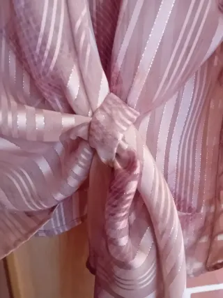 Elegante blusa con un diseño cruzado y detalle de nudo. - Tejido ligero con estampado de rayas verticales y detalles en tonos rosados. - Mangas largas abullonadas con puños. - Cuello camisero. - Cierre cruzado con nudo frontal.