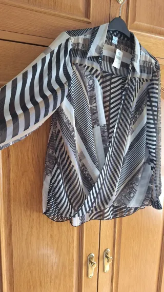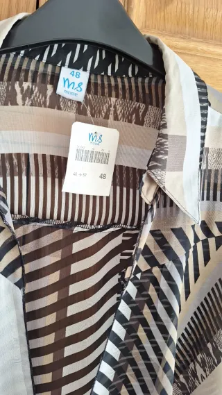 Blusa de señora con un llamativo estampado abstracto en tonos azules, blancos y marrones. Presenta un cuello camisero y dos bolsillos delanteros bastante amplios y botones con un toque brillante. Pone talla XL, pero da más para una XXL, es bastante grande. Excelente calidad. Por favor, pregúntame sobre el tiempo de envío. Hay veces que por mi trabajo no lo puedo enviar en el tiempo que marca la aplicación Mira mi perfil, hay muchas cosas interesantes a buen precio