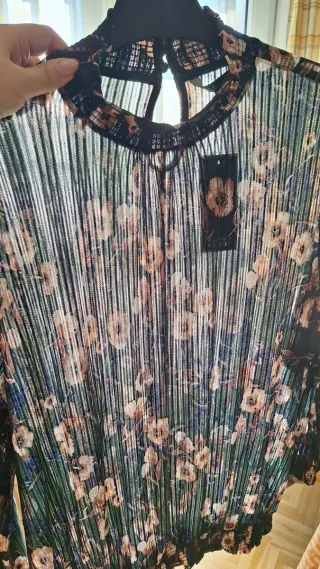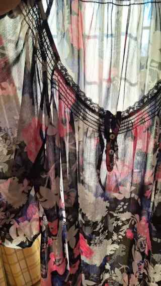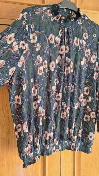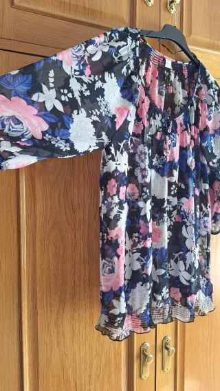 Blusa fina con estampado floral y manga larga. Presenta un detalle abierto en la espalda. Diseño con flores multicolores sobre fondo azul marino. Tejido ligero y cómodo. Talla XL de Springfield (se cortaron las etiquetas).