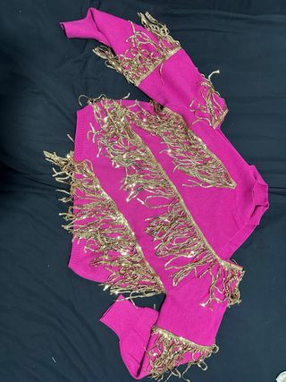 Hermosa blusa con flecos dorados con abertura en los hombros