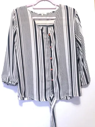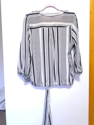 Blusa de rayas verticales en blanco y negro. - Diseño con cuello en V y botones frontales. - Manga larga abullonada. - Detalle de nudo en la parte delantera.