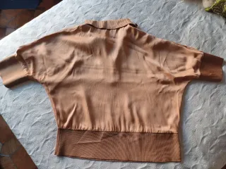 Blusa/camisa de mujer en color beige. Talla 50. Medidas: de hombro a hombro 44 centímetros; de sisa a sisa 52 centímetros; largo 67 centímetros.