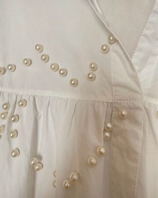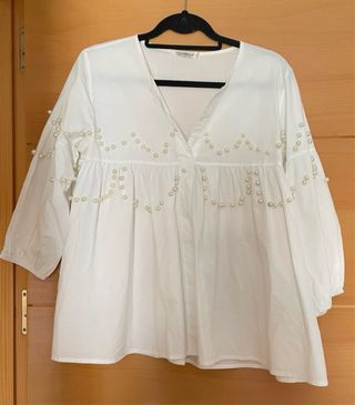Blusa blanca ancha con un diseño delicado y elegante. - Adornada con perlas. - Mangas amplias. - Cuello en V.