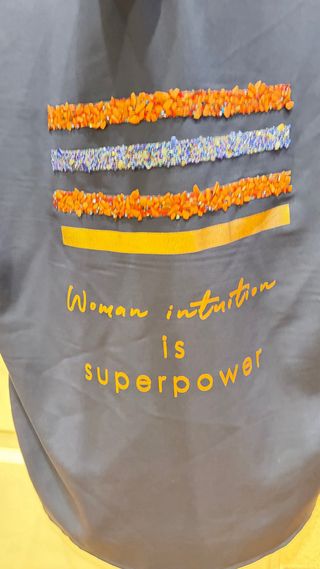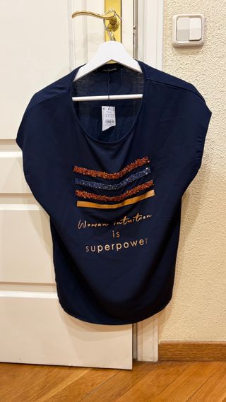 Blusa de color azul con un diseño único en la parte frontal. La prenda tiene un corte moderno y es cómoda de llevar. - Diseño con detalles de pedrería y tiras. - Frase Woman intuition is superpower estampada.