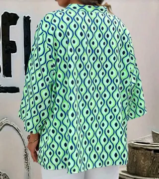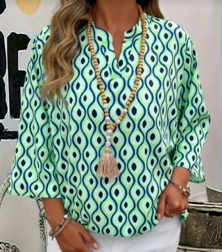 Blusa de primavera con un estampado llamativo y moderno. - Diseño con cuello mao y manga 3/4. - Tejido ligero y fluido. - Estampado geométrico en tonos verdes y azules. Tallas 52 y 54