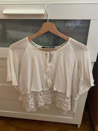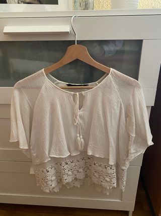 Blusa blanca de Zara con un diseño elegante y fresco. - Escote en V con detalles de encaje. - Mangas acampanadas. - Bajo con volantes y detalle de pompones. - Tejido ligero.