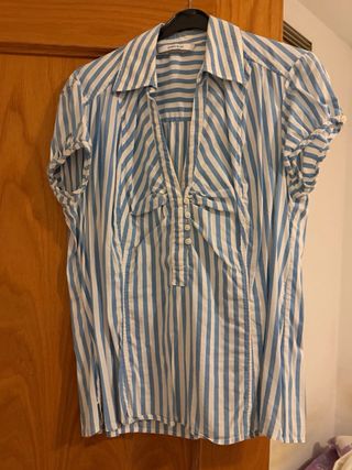 Blusa de manga corta con un diseño de rayas verticales. - Cuello camisero. - Cierre de botones en la parte delantera. - Detalle de fruncido en el pecho. - Aberturas laterales en el bajo.