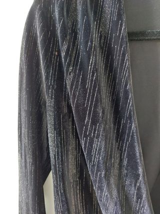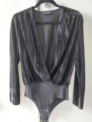 Body negro a modo de blusa, con hilo metalizado dorado, de manga larga, cruzado en la parte delantera, muy estiloso. Está nuevo, perfecto estado