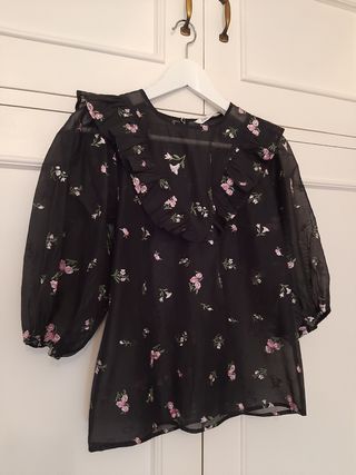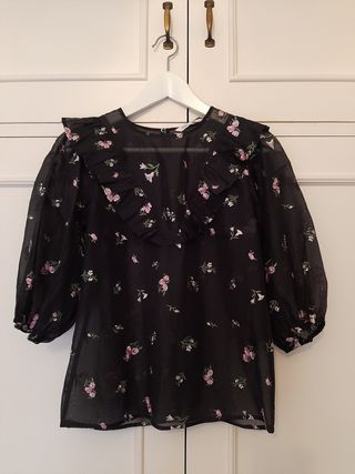 Blusa negra con bordados Zara talla XS. Tejido semitransparente. Manga francesa abullonada, terminada en goma. Volante delantero y trasero en forma de "V". Inspiración romántica. Bordados de flores en color rosa y verde. Cierre de botón en la espalda.