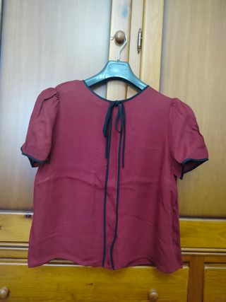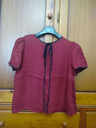 Blusa de manga corta en color vino con ribetes en negro y lazo en el cuello. Usada pero buen estado.