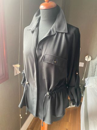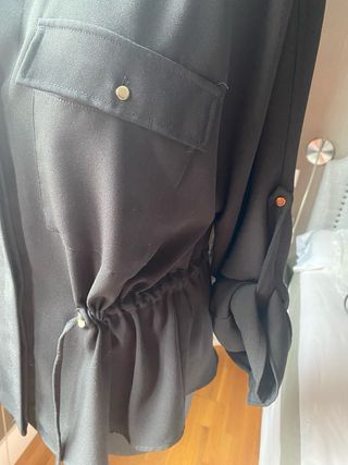 Elegante blusa de Zara con un diseño moderno y favorecedor. - Cuello camisero. - Bolsillos delanteros con solapa. - Cintura ajustable con cordón. - Mangas largas con opción de remangarse.