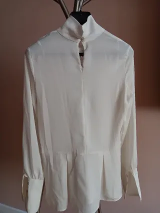 Blusa elegante de Zara, con un diseño moderno y detalles únicos. - Manga larga. - Puños con plisados. - Cuello alto. - Cierre de boton en la espalda.