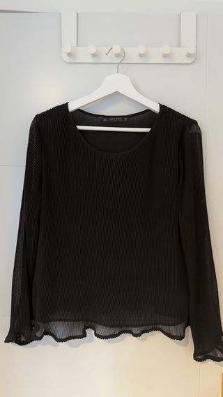 Elegante blusa negra de Zara con un diseño plisado y mangas largas. - Cuerpo principal con plisado vertical. - Mangas transparentes de gasa. - Cuello redondo. - Bajo con ligero vuelo.