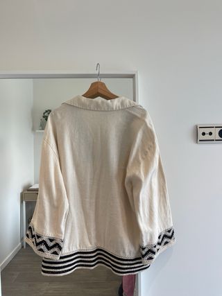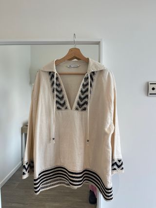 Blusa de Zara con un diseño étnico y detalles bordados. - Color beige con bordados negros. - Cuello camisero. - Manga larga. - Bajo con banda de rayas.