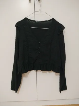 Elegante blusa negra de Zara. - Diseño de corte cropped. - Cuello camisero. - Cierre de botones. - Manga larga.