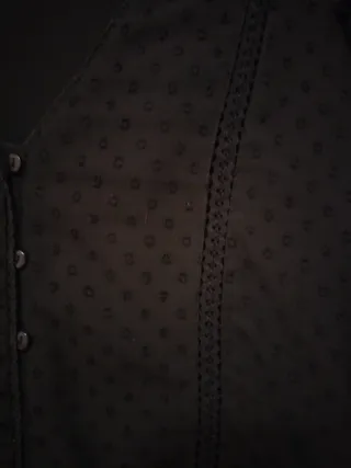 Elegante blusa negra de Zara con un diseño texturizado. - Tejido ligero y semitransparente. - Detalle de pequeños motivos florales en relieve. - Cuello camisero y cierre de botones. - Mangas largas abullonadas.