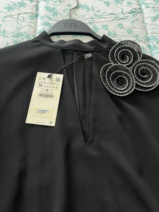 Elegante blusa negra de Zara con un detalle de flores en el hombro. Aún conserva la etiqueta. - Diseño con cuello alto. - Cierre de cremallera en la espalda - Adorno floral tridimensional.