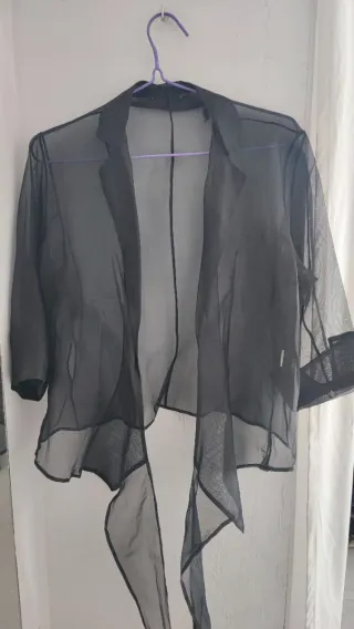 Elegante y original blusa en color negro con detalle semitransparente en espalda, y manga 3/4, de la firma Zara, en talla XS. Un único uso. Medidas: Largo 50cm Largo de manga 51cm Ancho hombros 37cm. Hago envíos, también se puede recoger en calle Jaime el Conquistador (28045, cerca de los metros Legazpi y Delicias).