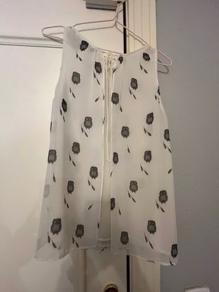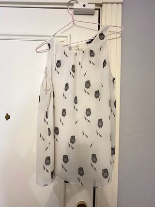 Blusa mujer, blanca con detalles de buhos en negro, talla M Elegante