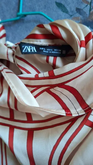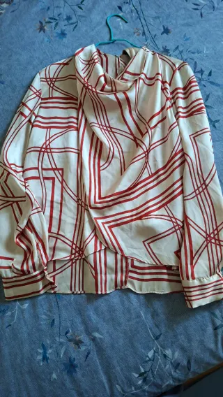 Blusa elegante de Zara, con un diseño llamativo. - Estampado geométrico en tonos rojos y fondo color champang. - Cuello drapeado. - Manga larga. - Lazo en el cuello para enlazar en la parte de atrás. - 100% poliester.