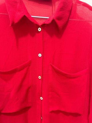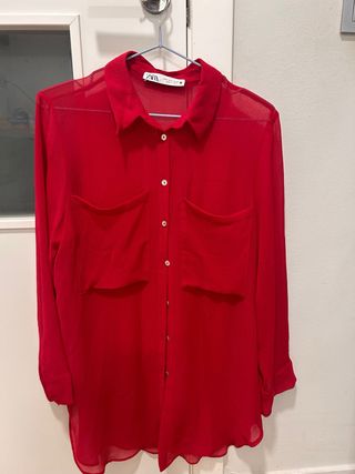 Camisa elegante de Zara en color rojo, con un diseño transparente y manga larga. Perfecta para añadir un toque sofisticado a tu armario. - Tejido ligero y vaporoso. - Cierre de botones en la parte frontal. - Cintura elástica para un ajuste cómodo. - Mangas abullonadas con puño.